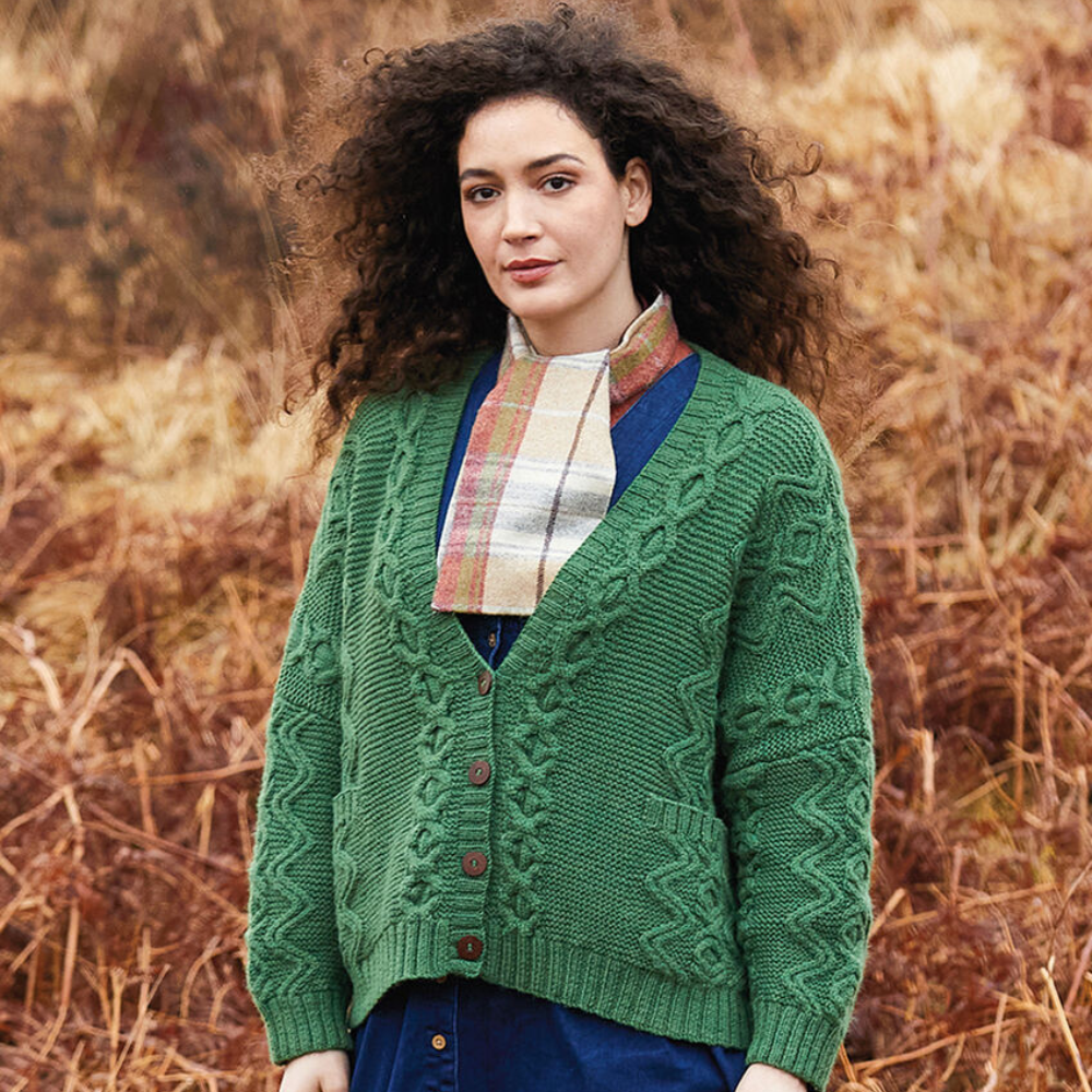 This one colour, cable cardigan by Lisa Richardson is a stand-out knit. Interesting cables are given space to really shine by the wide panels of garter stitch in between. A deep v-neck, button fastening and handy pockets make this Alpaca Soft knit a must for autumn.