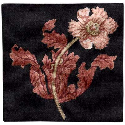 Needlepoint kit for miniature. An adorable miniature adapted from the cushion design. Its delicacy is obtained by printing it on 18 to the inch canvas. It can be made into a small square cushion or the finished piece can be extended by using complementary fabric as illustrated. It is also available in blue. This design makes a wonderful trio with the Rose and Tulip miniatures.