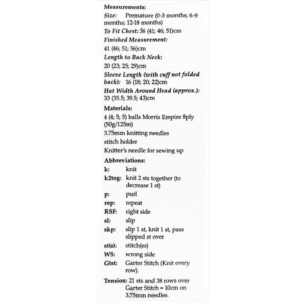 Hat and Jacket Requires: 4 (4; 5; 5) balls Morris Empire 8ply, 3.75mm 35cm knitting needles, 4 (5; 5; 6) 12mm buttons.