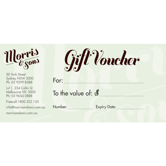 Morris & Sons Gift Vouchers are delivered digitally by email and contain instructions to redeem them at checkout.