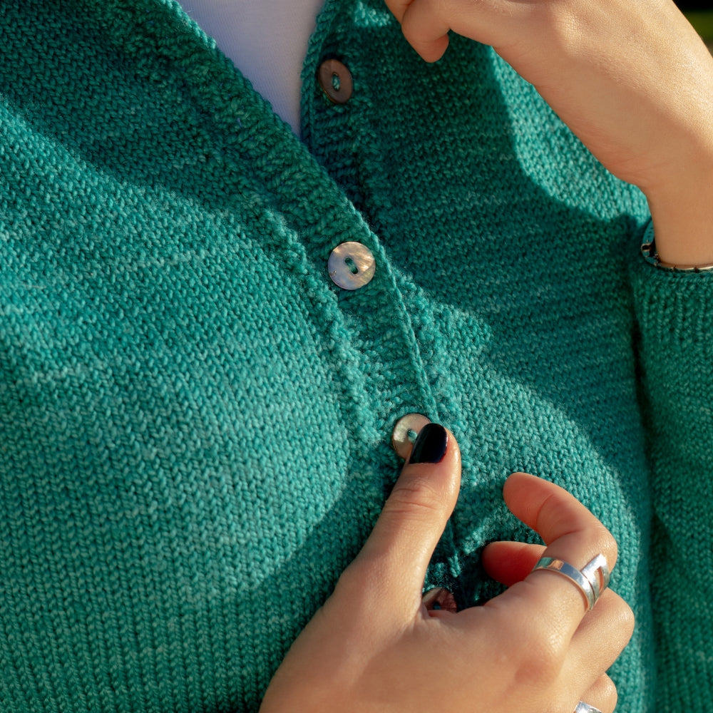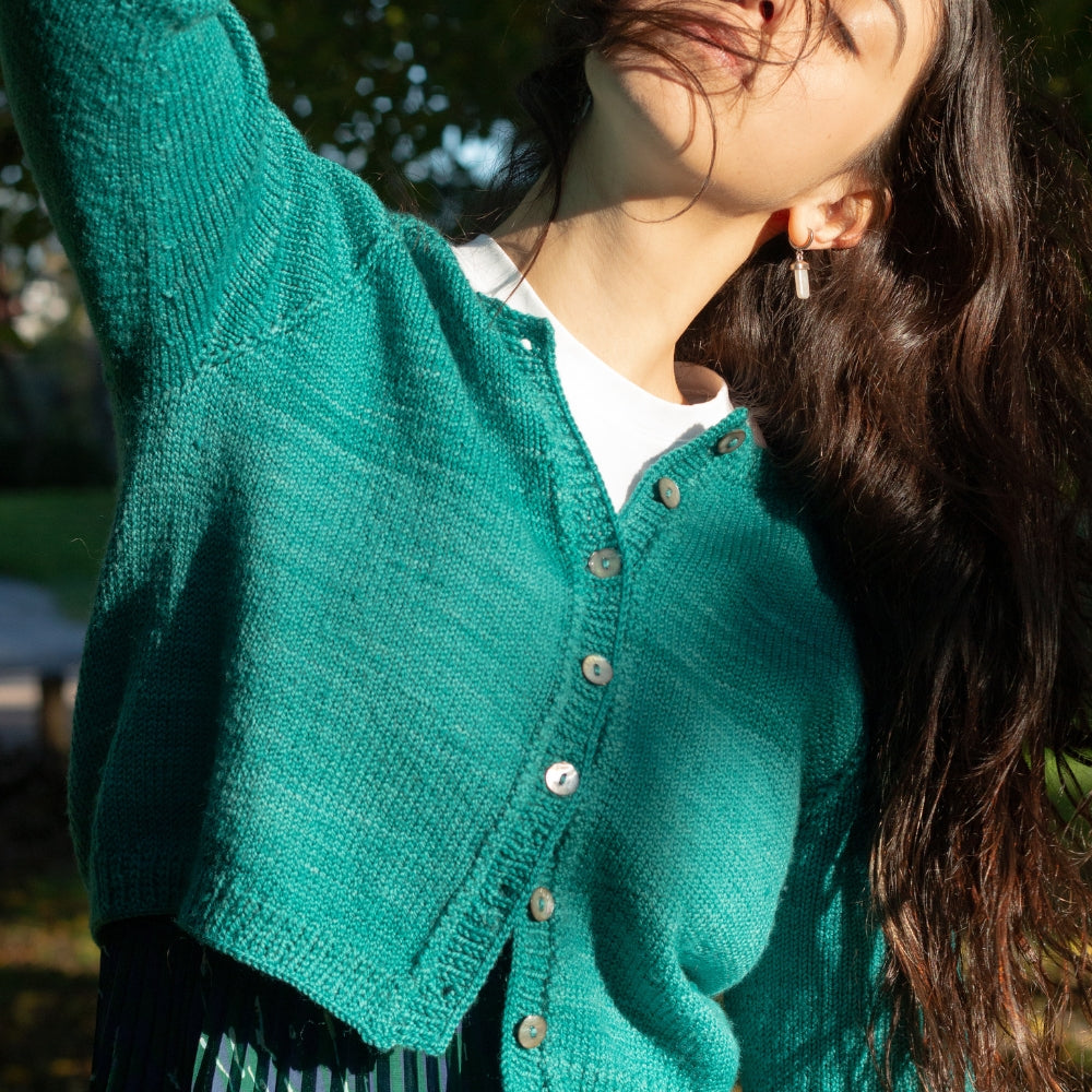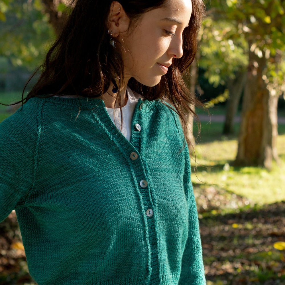 Montevideo is a cute little raglan sleeve cardigan with a simple shape and construction. It has a beautiful herringbone detail running at the raglan and placket seam. Montevideo can be knitted in either Manos Sami (same as the sample pictured) or Manos Marla, if you are looking for a solid or colourful style. It is knitted top down and the pattern includes two lengths for a cropped or longer body. It is very easy to adjust the length to your desired fit.