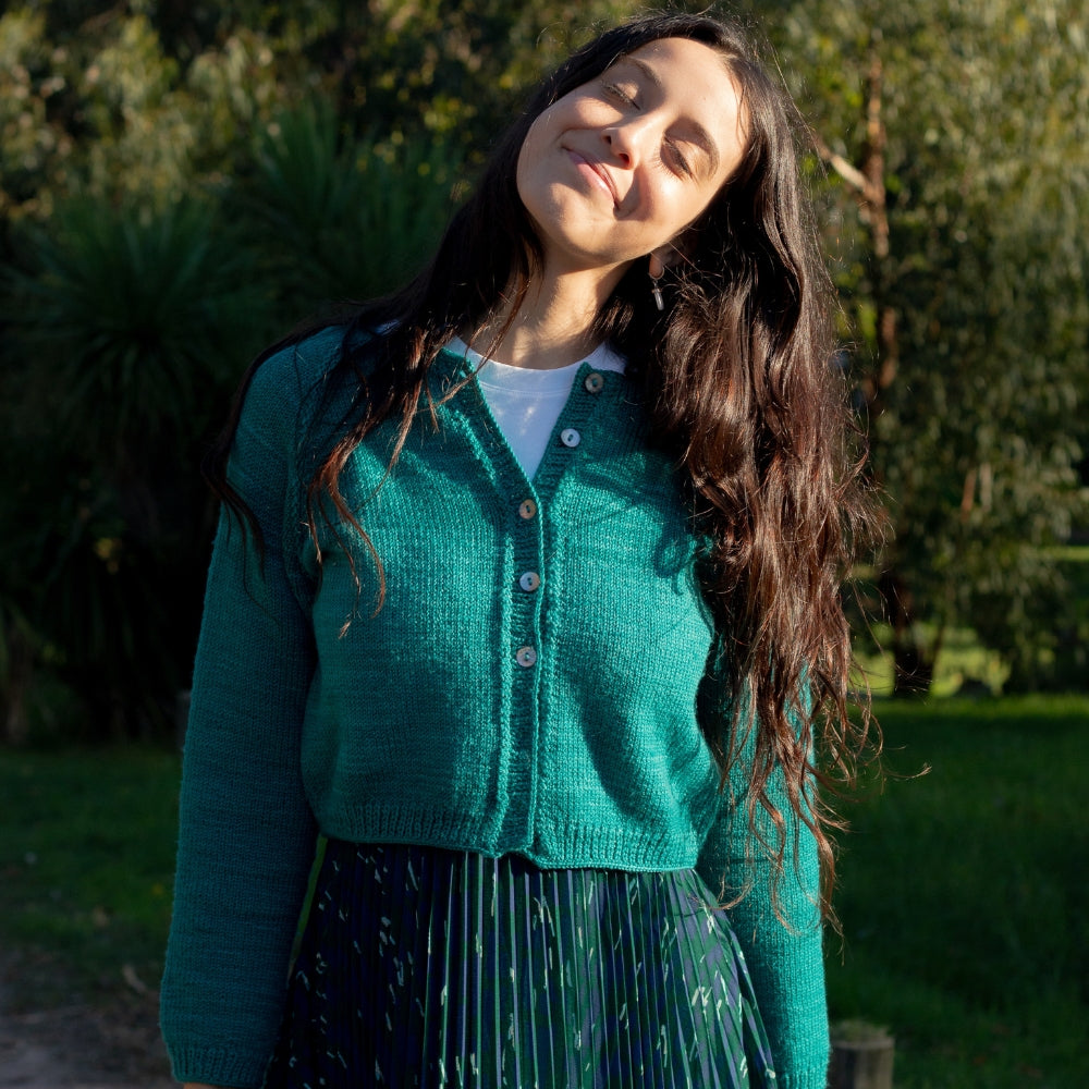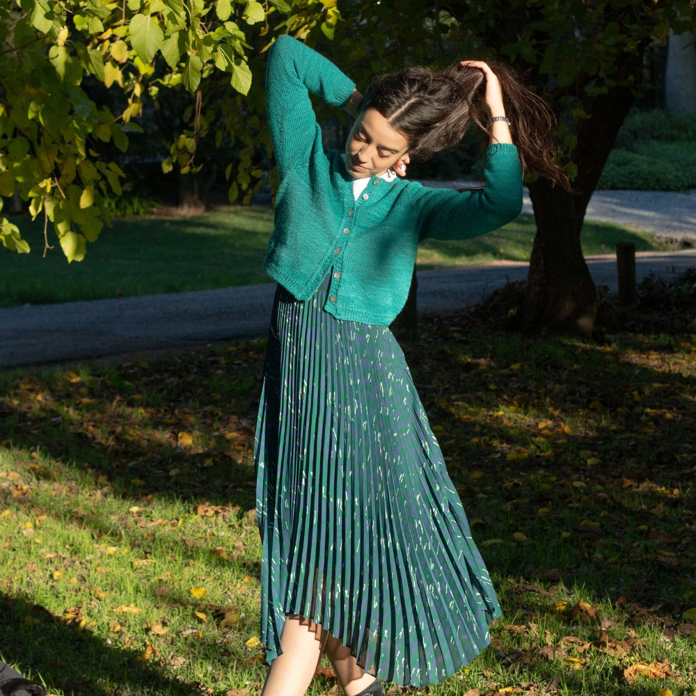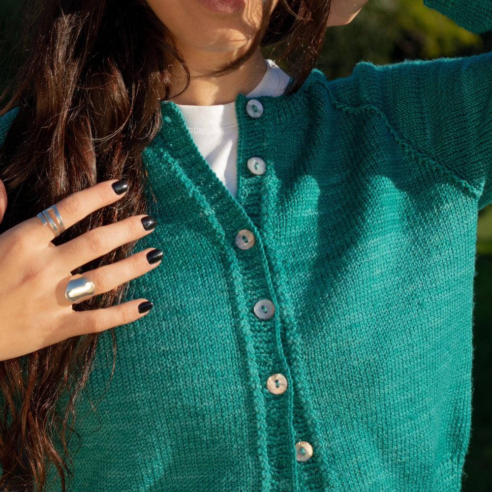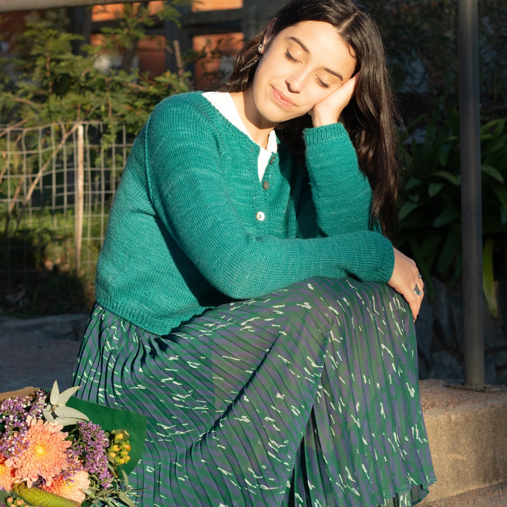 Montevideo is a cute little raglan sleeve cardigan with a simple shape and construction. It has a beautiful herringbone detail running at the raglan and placket seam. Montevideo can be knitted in either Manos Sami (same as the sample pictured) or Manos Marla, if you are looking for a solid or colourful style. It is knitted top down and the pattern includes two lengths for a cropped or longer body. It is very easy to adjust the length to your desired fit.