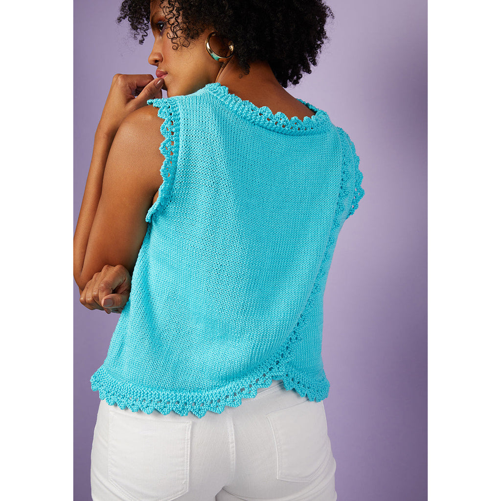 This sleeveless tank top has a pretty lace edging at the neckline, armholes and hem that is knit separately and attached as part of the making up process. The main body of the top is knitted in stocking stitch throughout using the beautifully versatile Cotton Glace and the back is worked in two separate pieces that wrap over one another at the right shoulder.