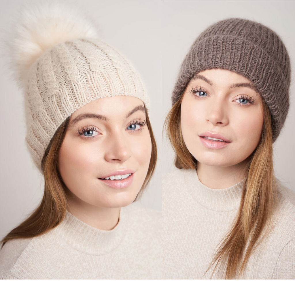 Josie is knit in an all over cable design and Riley in 1x1 rib. Instructions for the beanies are written both flat and sewn together or knit in the round seamlessly. Both beanies are sized to fit an average adult woman's head.