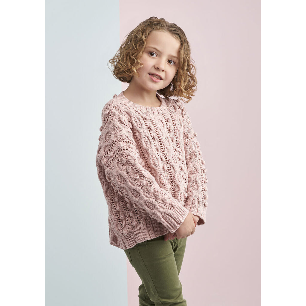 This children's sweater has an all-over lace and bobble pattern and features a round neck, drop-shoulder sleeves and ribbed collar, cuffs and hem. Designed by Martin Storey, it is knitted in the luxuriously soft Cotton Cashmere.