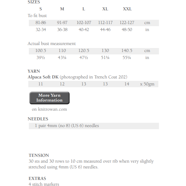 This kit contains the pattern and the yarn required for your favourite size in colour 202 Trench Coat.
