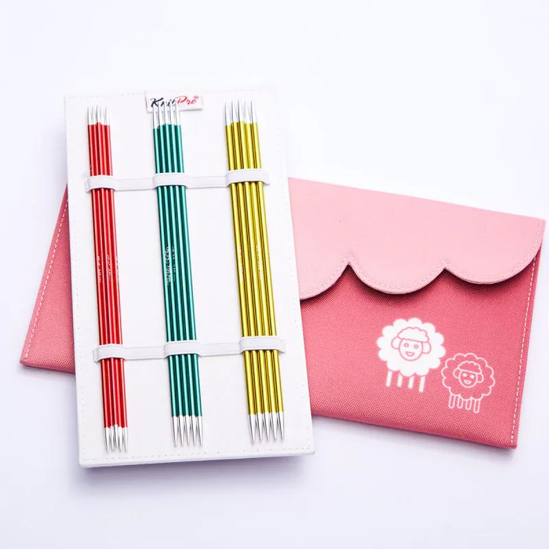 Packaging: Each set of 5 (per size) double-pointed knitting needles is securely stored and packaged in a pretty envelope-style pink fabric case.