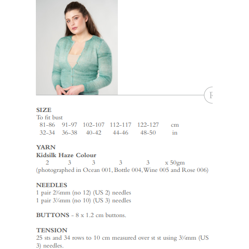 Belle by Lisa Richardson is a stylish round neck cardigan, trimmed with pretty moss stitch edgings. Originally designed for Kidsilk Haze, Belle has been reworked using Kidsilk Haze Colour – the next generation of this much-loved yarn. The simplicity of the stocking stitch shows off the gentle washes of colour beautifully.