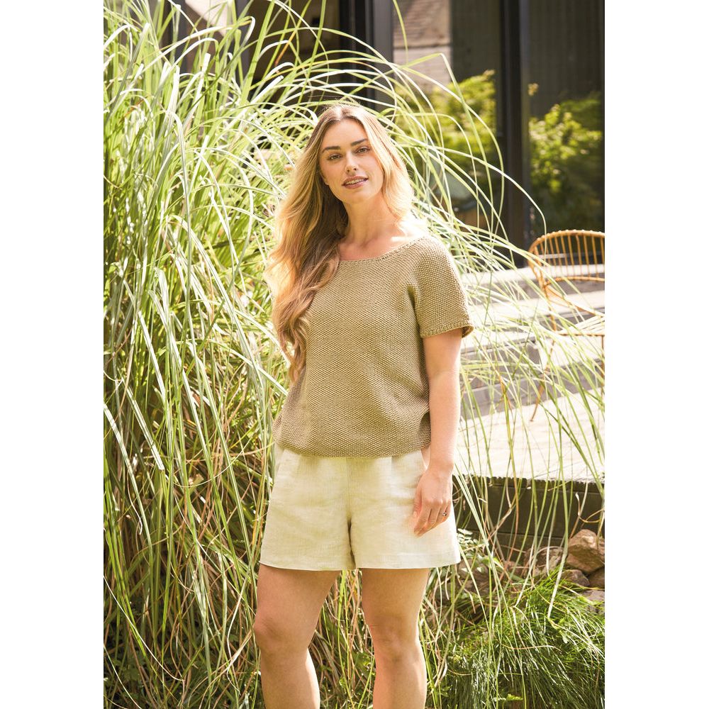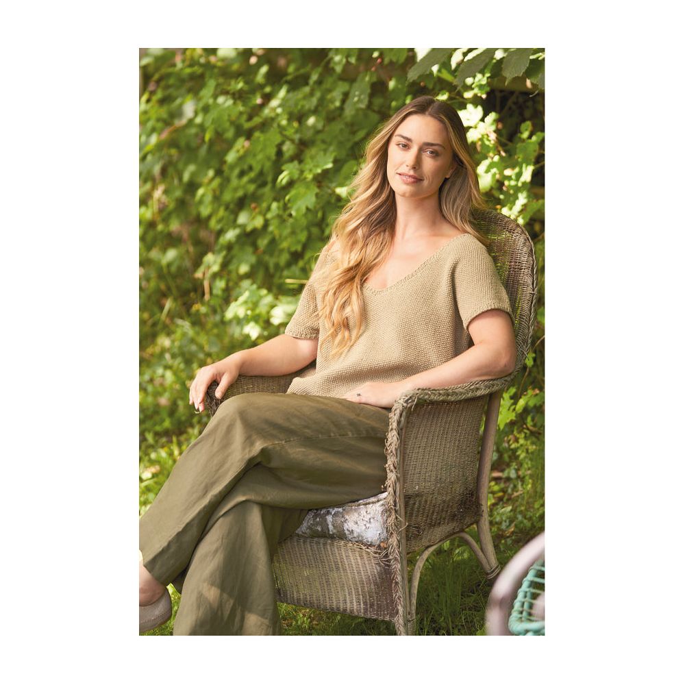 This soft tee from Lisa Richardson is knitted in a simple moss stitch using one shade of Cotton Revive. Beautifully finished with ribbing at the neck and cuffs.