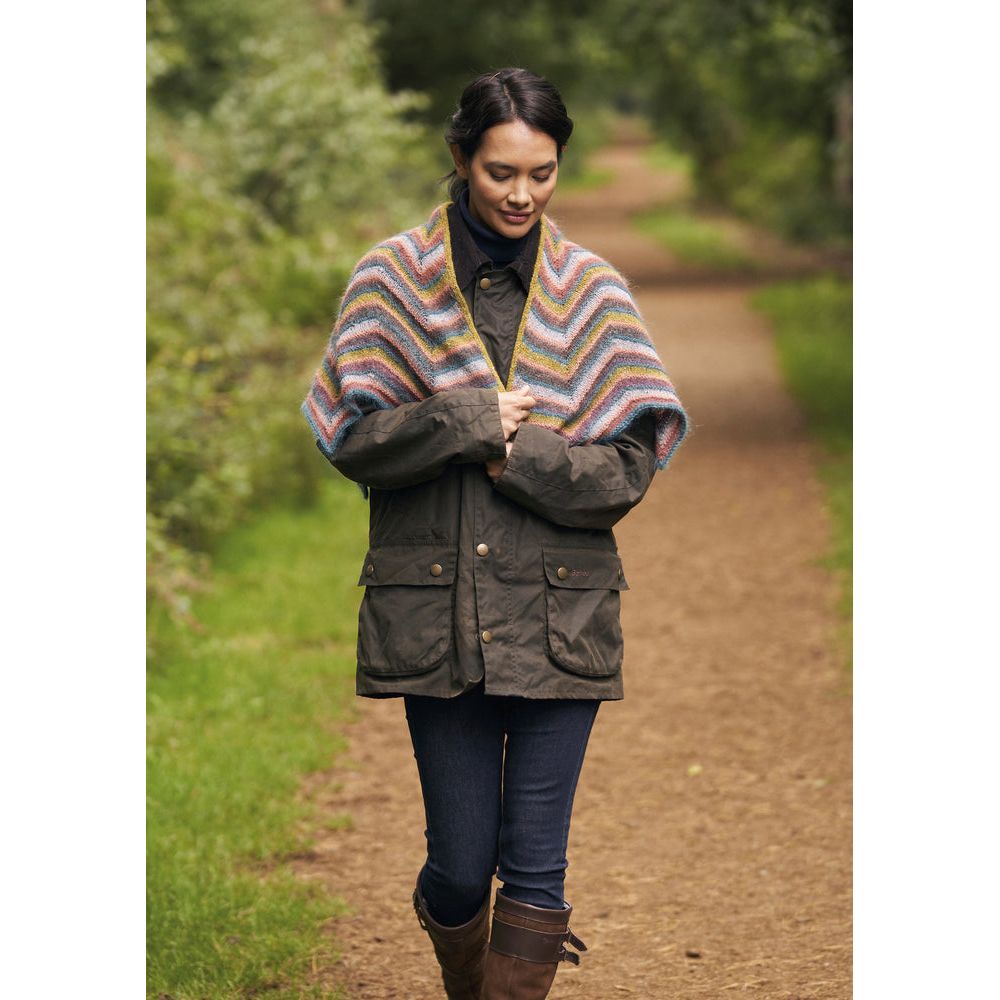 Kidsilk Haze and Felted Tweed are beautifully combined in this striped shawl from Lisa Richardson. Clever shaping, striped ridges and a carefully chosen palette all come together to create this classic accessory.