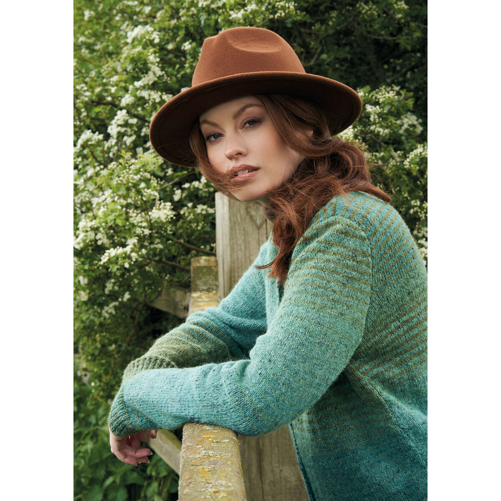 This classic crew neck cardigan is simple to knit and easy to wear. The graduated stripes colour effect is achieved by using two balls of yarn at once and working two rows alternately from each ball throughout. Designed by Martin Storey, the cardigan features long set-in sleeves, button front closure and rib details at the neck, cuffs and hem.