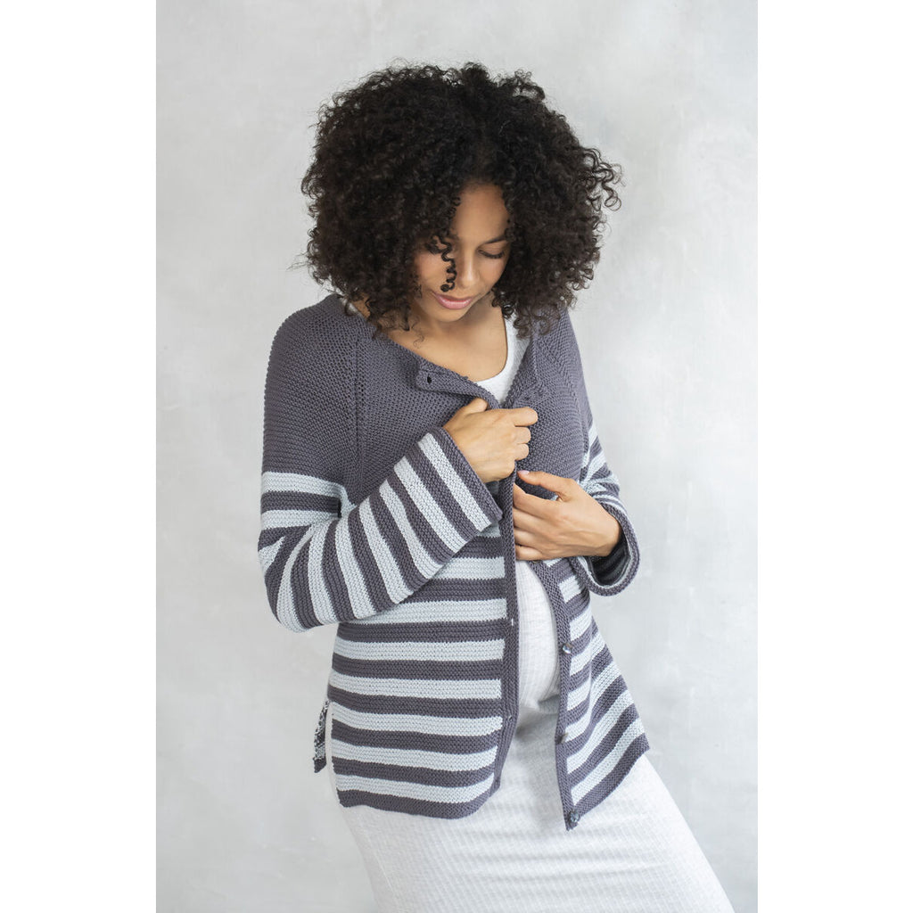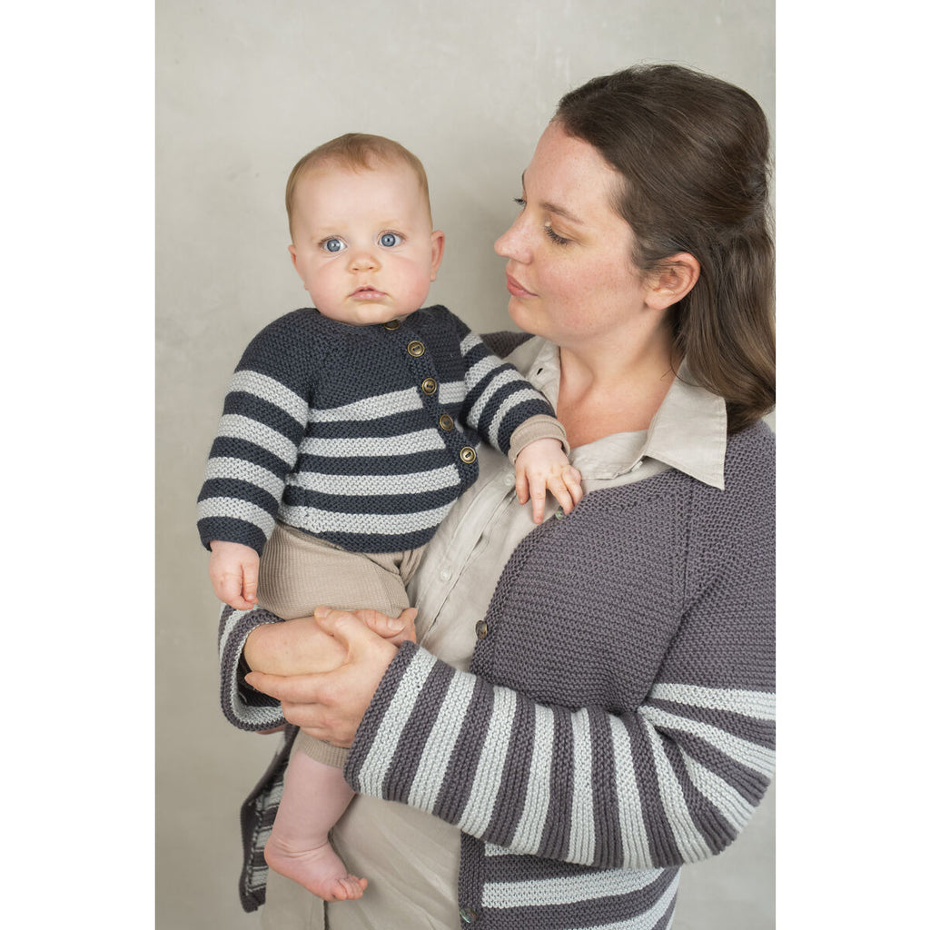 This is a lovingly crafted, cosy as well as comfortable collection of knits for both mum and baby. All worked in Rowan’s ever popular, supersoft Summerlite DK and Baby Cashsoft Merino yarns. Interchangeable yarns to suit all seasons and knit fibre preference. Classic, basic wardrobe designs including matching Breton stripe cardigans for mum and baby, cute ‘busy bee’ logo sweater, simple spot and sweet lace textures, snuggly stripe hat and a relaxed fit, throw on cable cardigan for the new mum or mum to be.