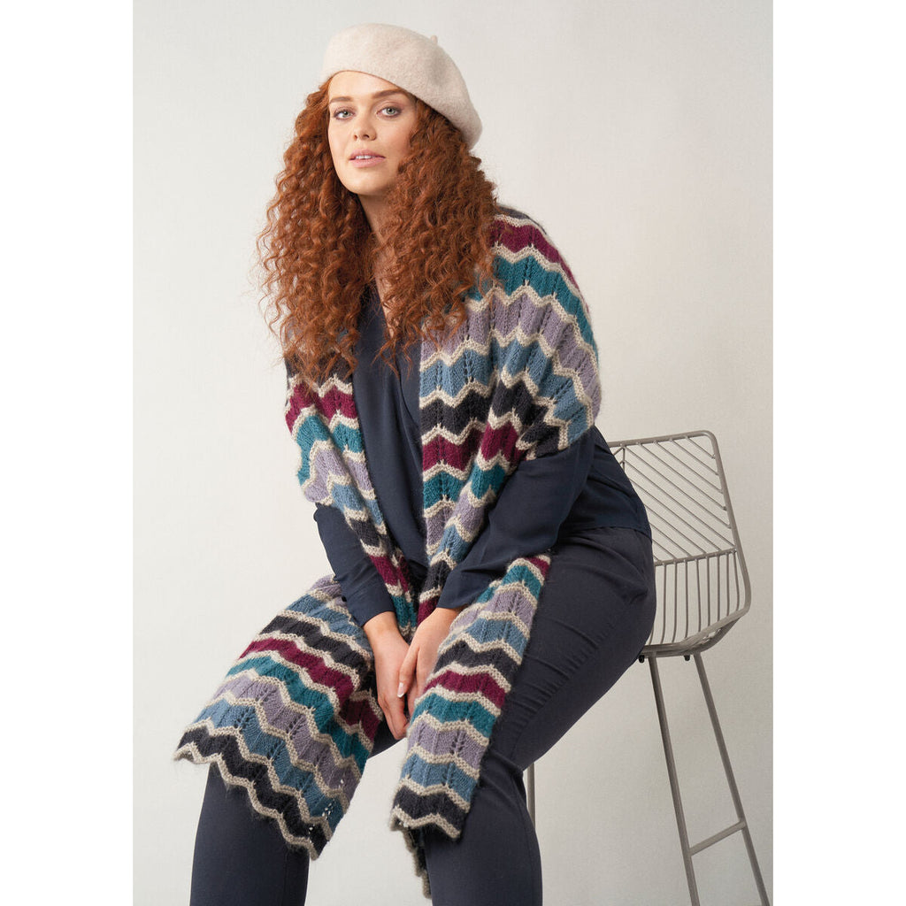 Martin Storey has used a carefully curated palette of six shades of Kid Classic for this eye-catching scarf. Deep bands of chevrons are bordered by garter stitch ridges, making the jewel-like tones pop. Calypso is knitted in two pieces which are grafted together at the centre, giving each end of the scarf a unique chevron edge. This wide scarf is a stylish, yet practical, winter accessory.