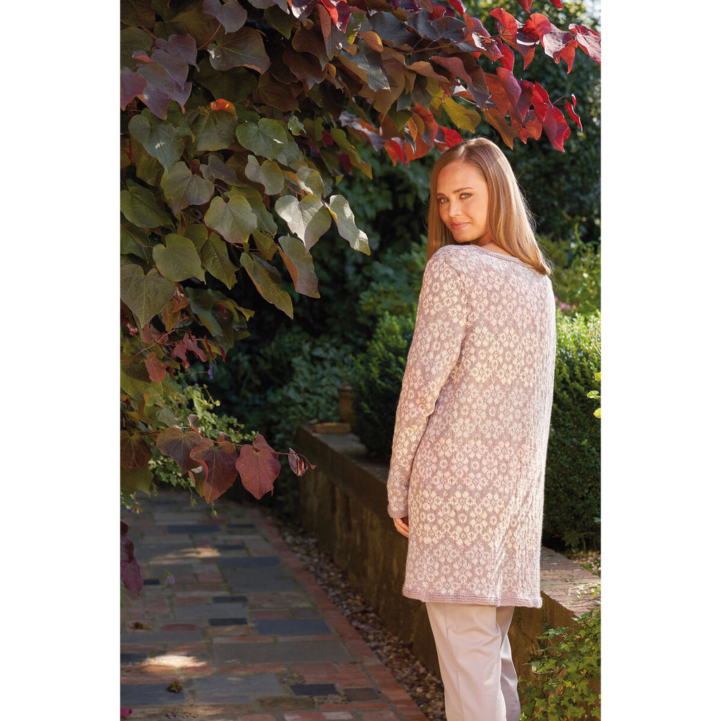 Designed by Martin Storey, Fleur is a long-length cardigan worked in four delicate shades of Summerlite DK. The floral fair isle design subtly shifts from one shade to the next, whilst this elegant cardigan features set-in sleeves and a simple garter stitch trim.