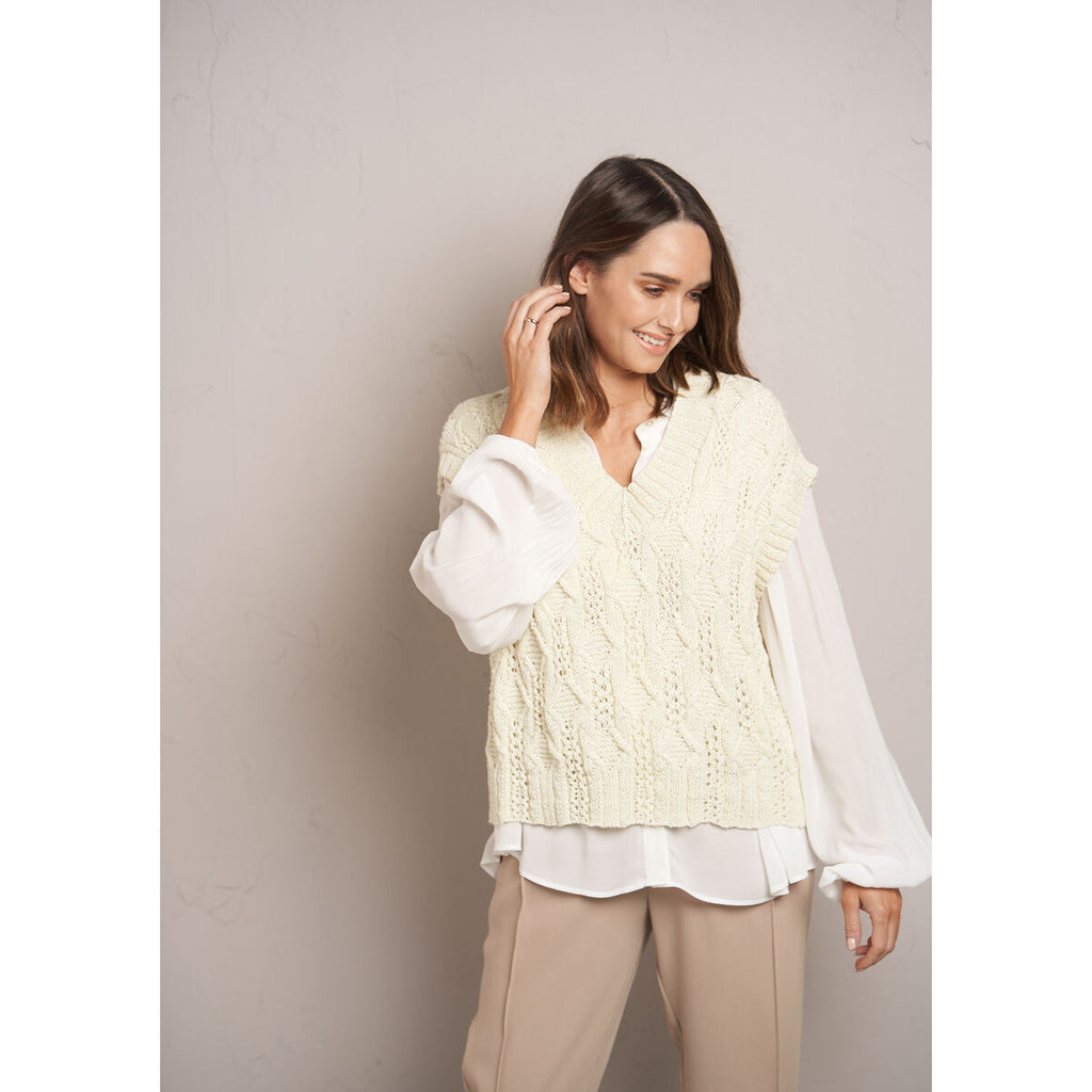 This sleeveless pullover, designed by Martin Storey, is worked in one shade of the beautifully soft Cotton Glacé. Spun using a mercerised cotton, this yarn gives incredible stitch definition to the all-over cable pattern featured in this design.