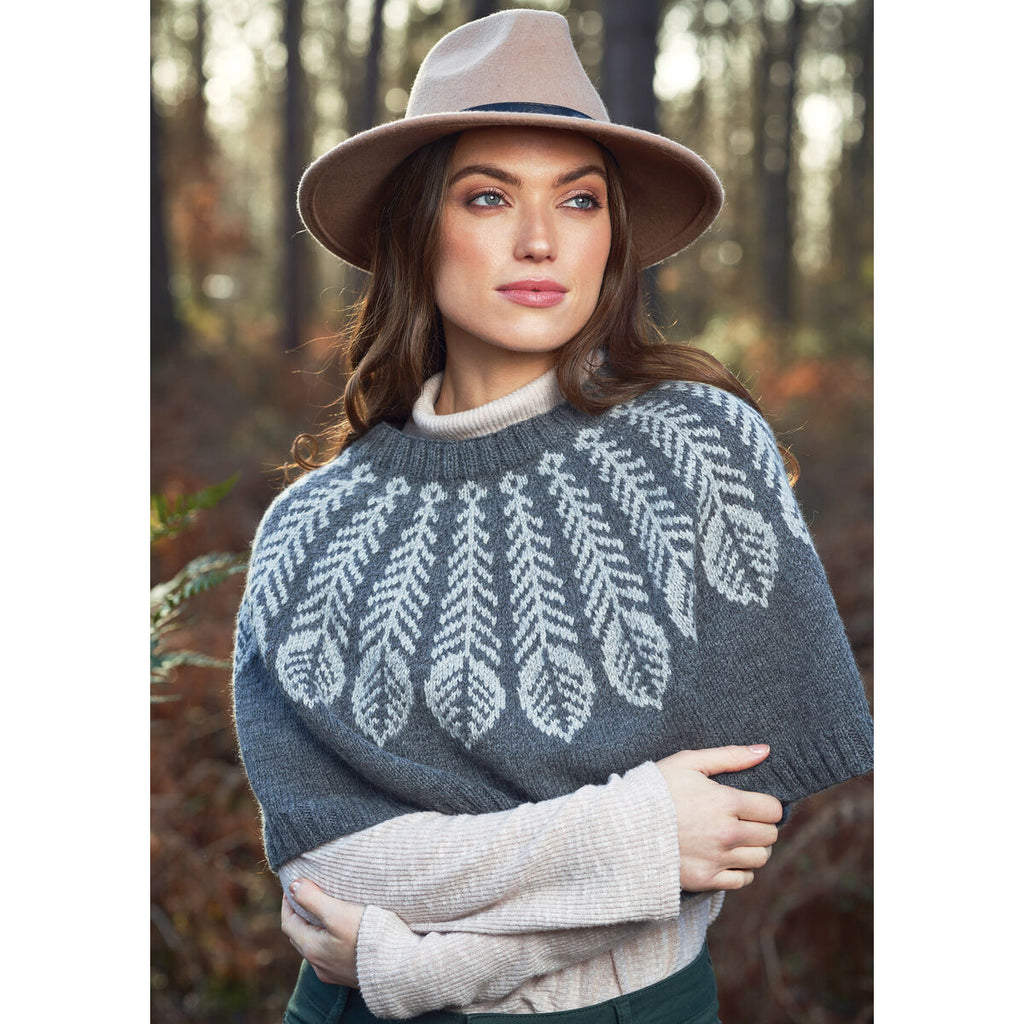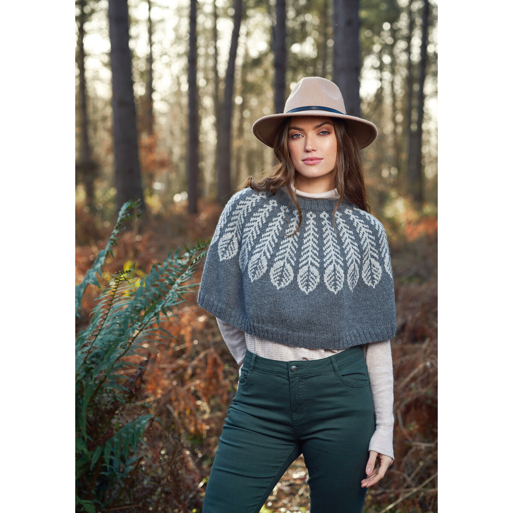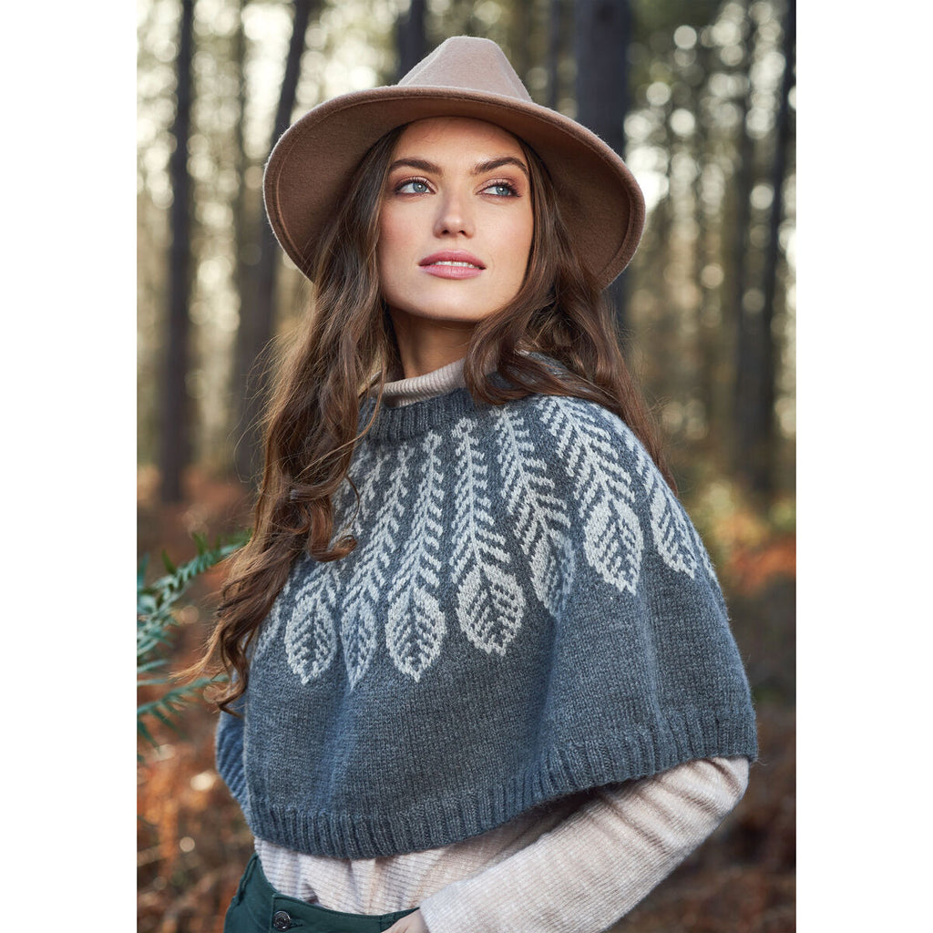 Folkloric feathers make an eye-catching statement around the neck of this short poncho designed by Martin Storey in Alpaca Soft. Decreases between the feathers create the subtle shaping.