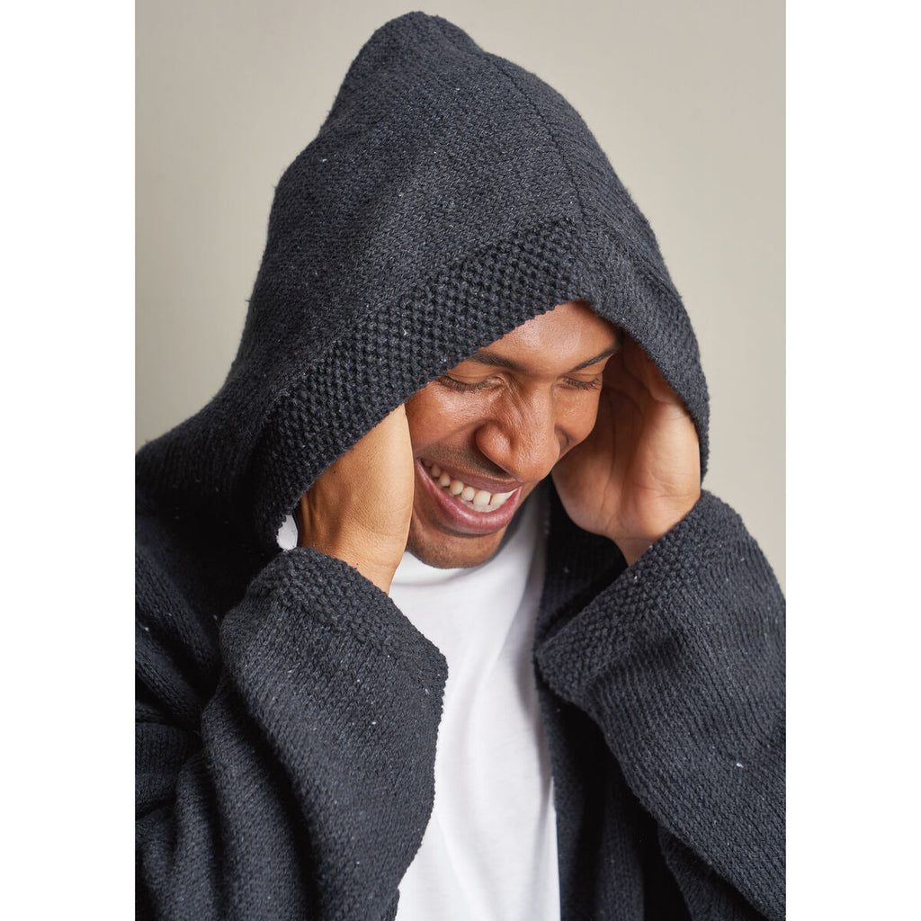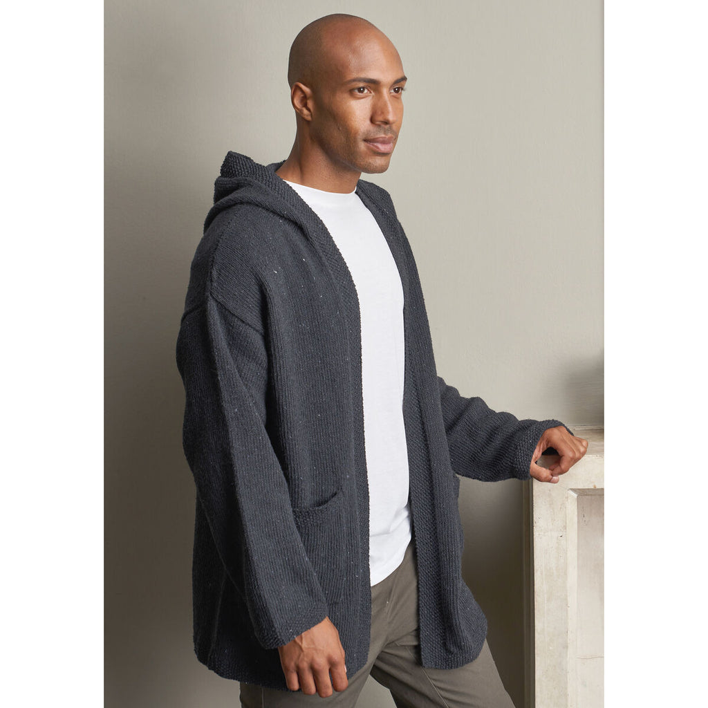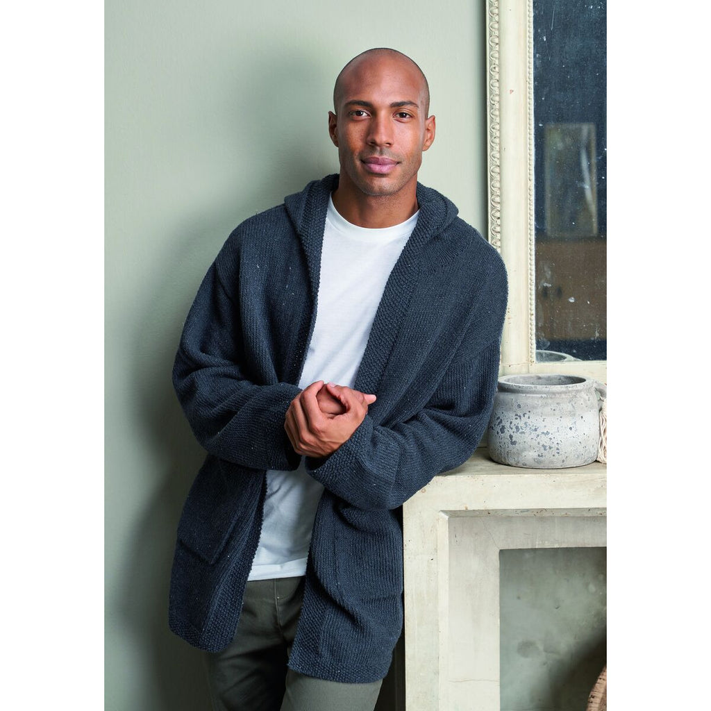 A relaxed cardigan perfect for lounging around the house, this design by Martin Storey features patch pockets, a generous hood and set-in sleeves. Worked mainly in stocking stitch, a moss stitch edging is added for a textural flourish. This design is knitted in the very popular Denim Revive.
