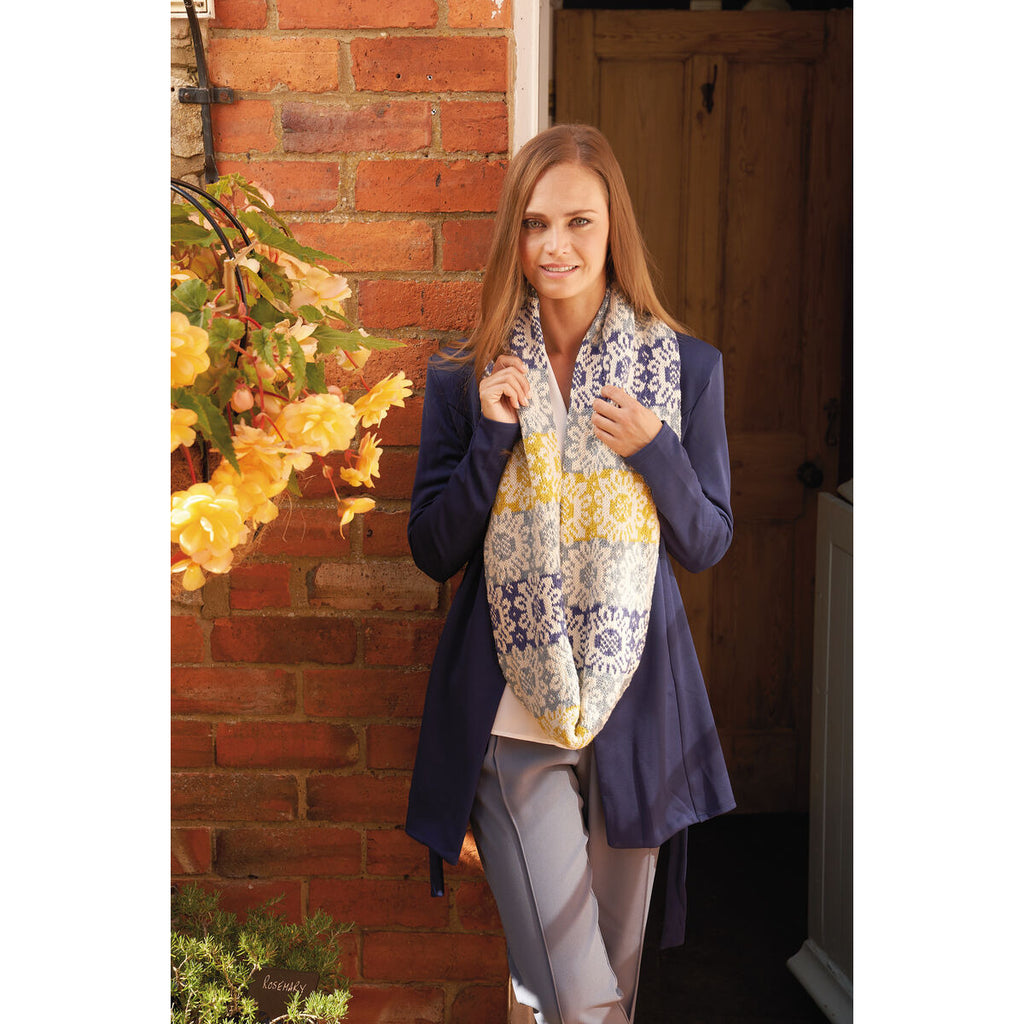 This versatile cowl design by Martin Storey features a bold floral motif which is cleverly worked in a neutral shade throughout, whilst the background dramatically shifts from dark blue, to light blue, to a stand-out summery yellow. Using Summerlite DK, the cowl is worked in the round on circular needles, creating a long tube, with only the right-side of the knitting on show.