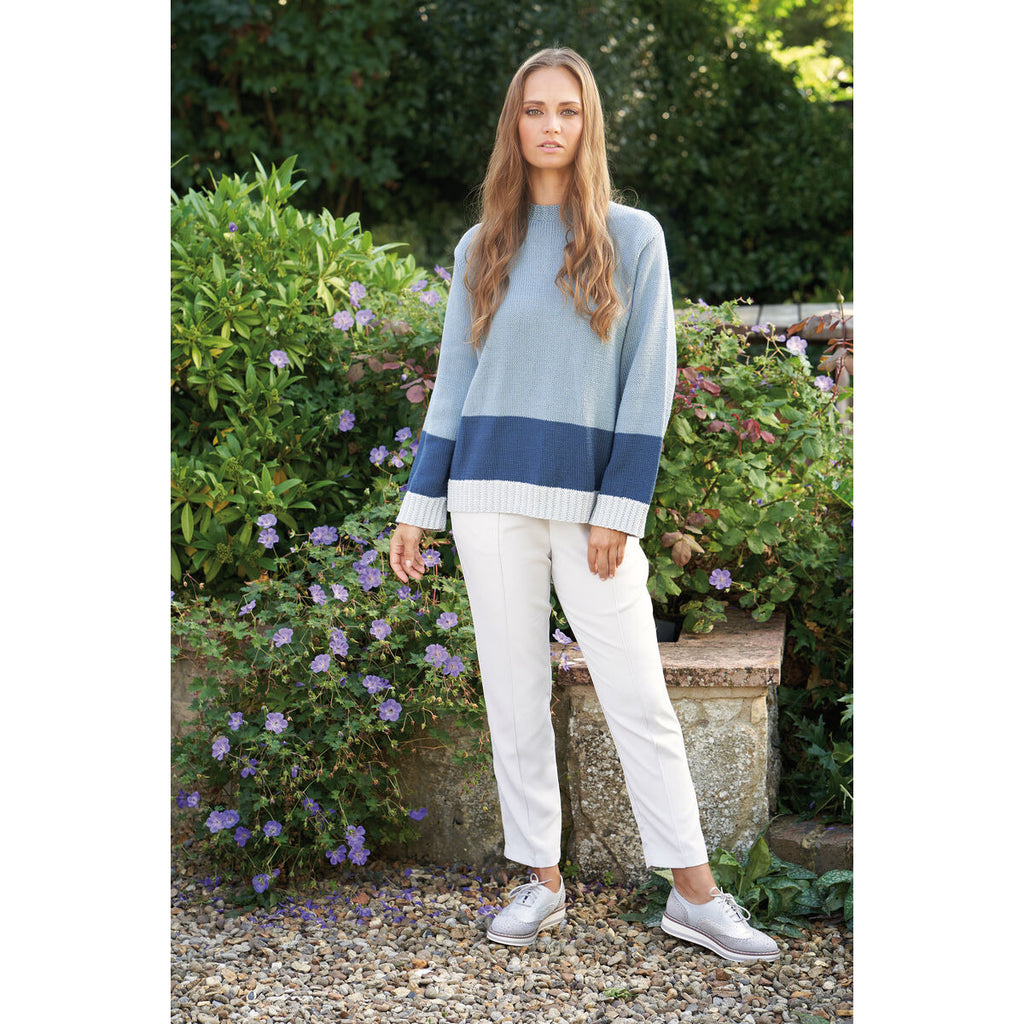This stylish sweater by Martin Storey uses bold colour blocking to great effect. The stocking stitch bands of colour are framed by an uneven rib at the welt and cuffs, and the semi set-in sleeves give a relaxed feel. Martin has used three shades of Summerlite DK in denim blues, creating a classic summer look.