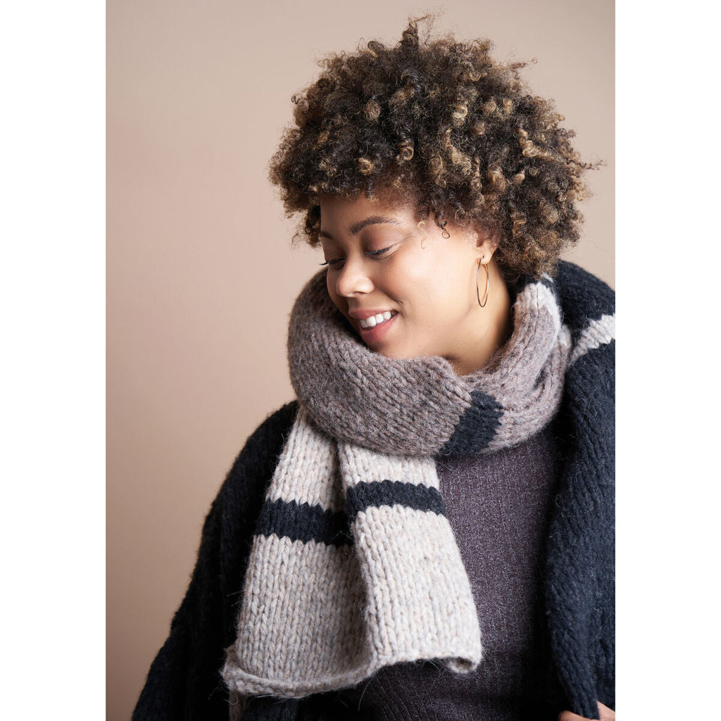 This statement scarf has a bold striped pattern along its length and is knitted using the lightweight Brushed Fleece held double throughout. Slip stitch is used for the edging and then stocking stitch along the rest of the rows. This is a design by Quail Studio.