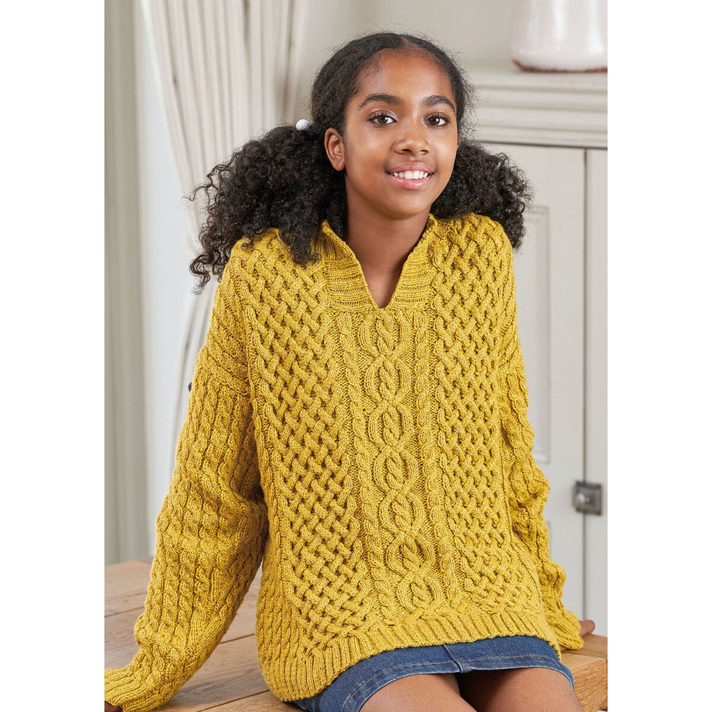 Kids love a slouchy sweater. This version features traditional cable stitch patterns, while keeping the shape modern and easy to wear.