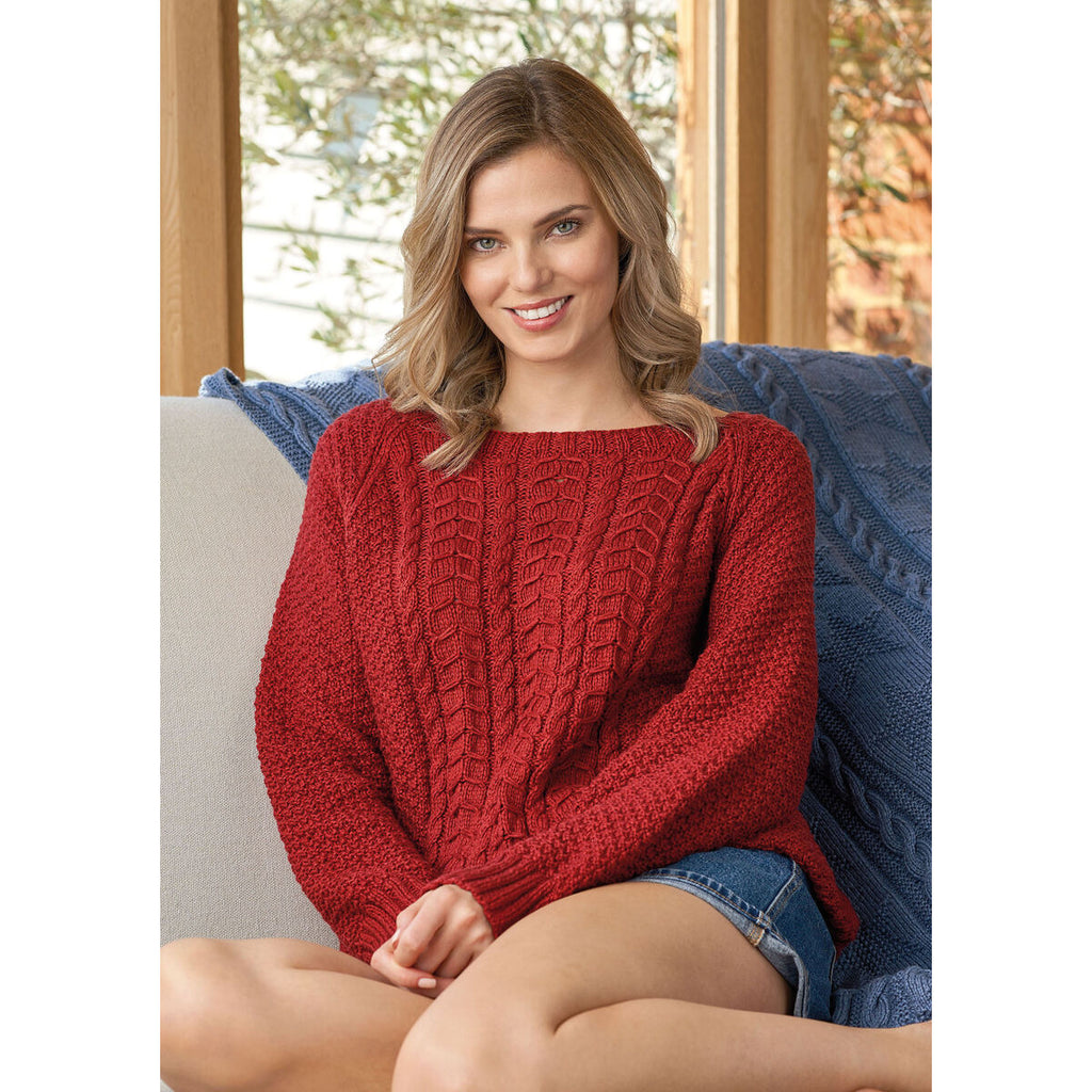 This boat-neck raglan sweater has an over-sized fit and all over cable and texture patterns - perfect for beach walks.