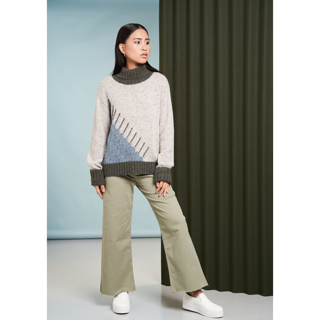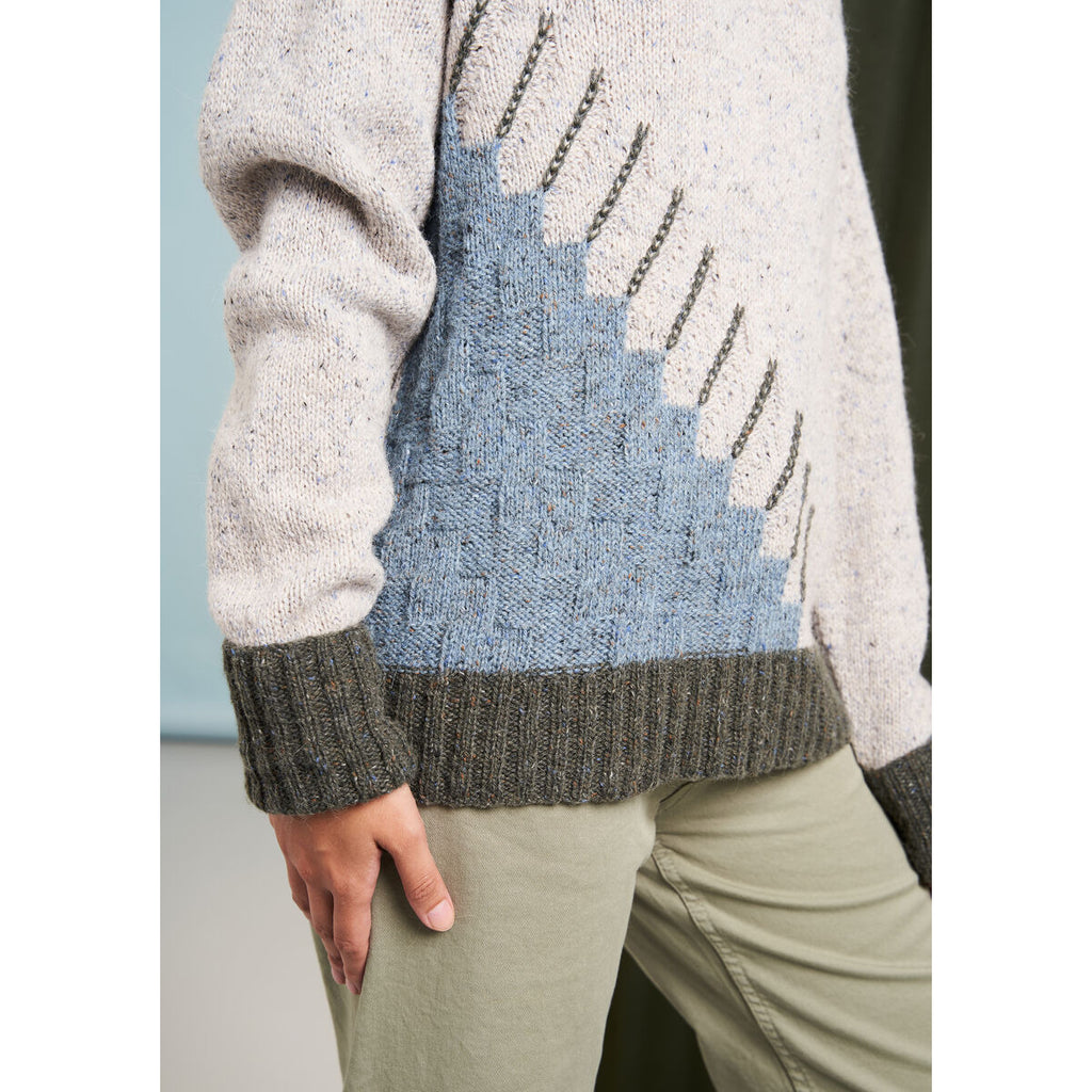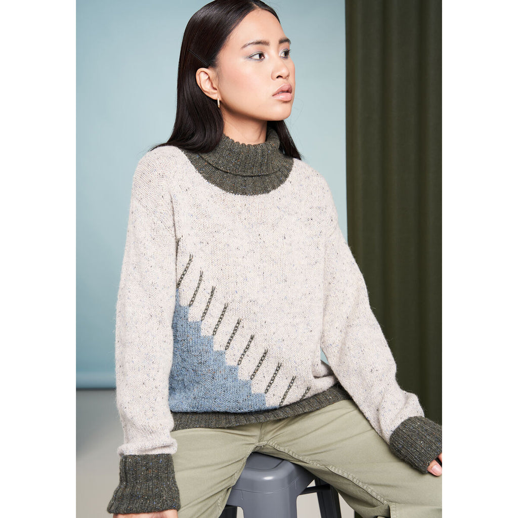 Designed by Georgia Farrell, this funnel neck sweater features a stepped, asymmetrical intarsia design on the front. Knitted in the ever popular Felted Tweed, using stocking stitch throughout, the sweater also features long sleeves and contrast colour ribbing at the neck, cuffs and hem.