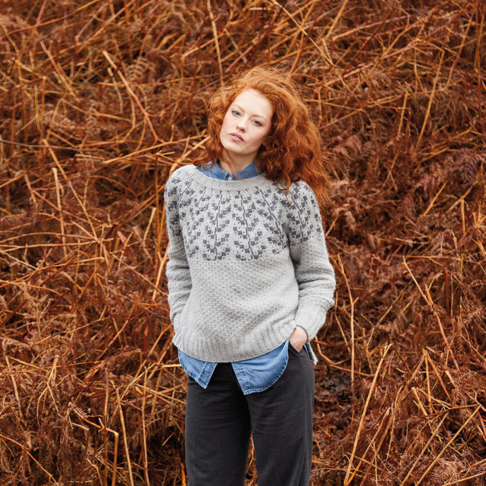 Knitted top down and in the round, Florence Spurling’s Alpaca sweater features a pretty Fair Isle yoke pattern. This two-colour design leads into a delicately textured body and sleeves, trimmed with a classic rib. A charming knit for everyday layering.