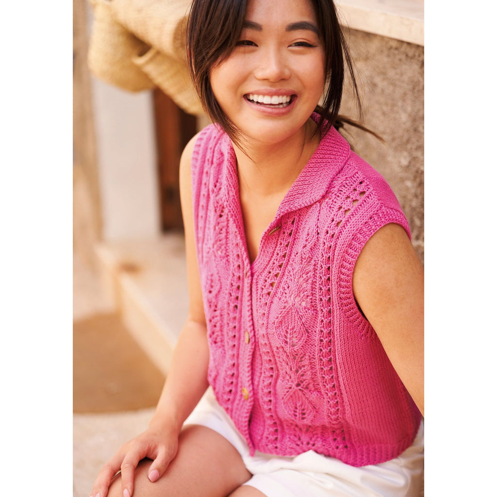 This sleeveless cardigan from Martin Storey features lovely lace panels depicting a delicate leaf design. Knitted in Summerlite DK, whose exquisite stitch definition is just perfect for texture, this pure cotton knit with a cute collar is perfect for hot summer days.
