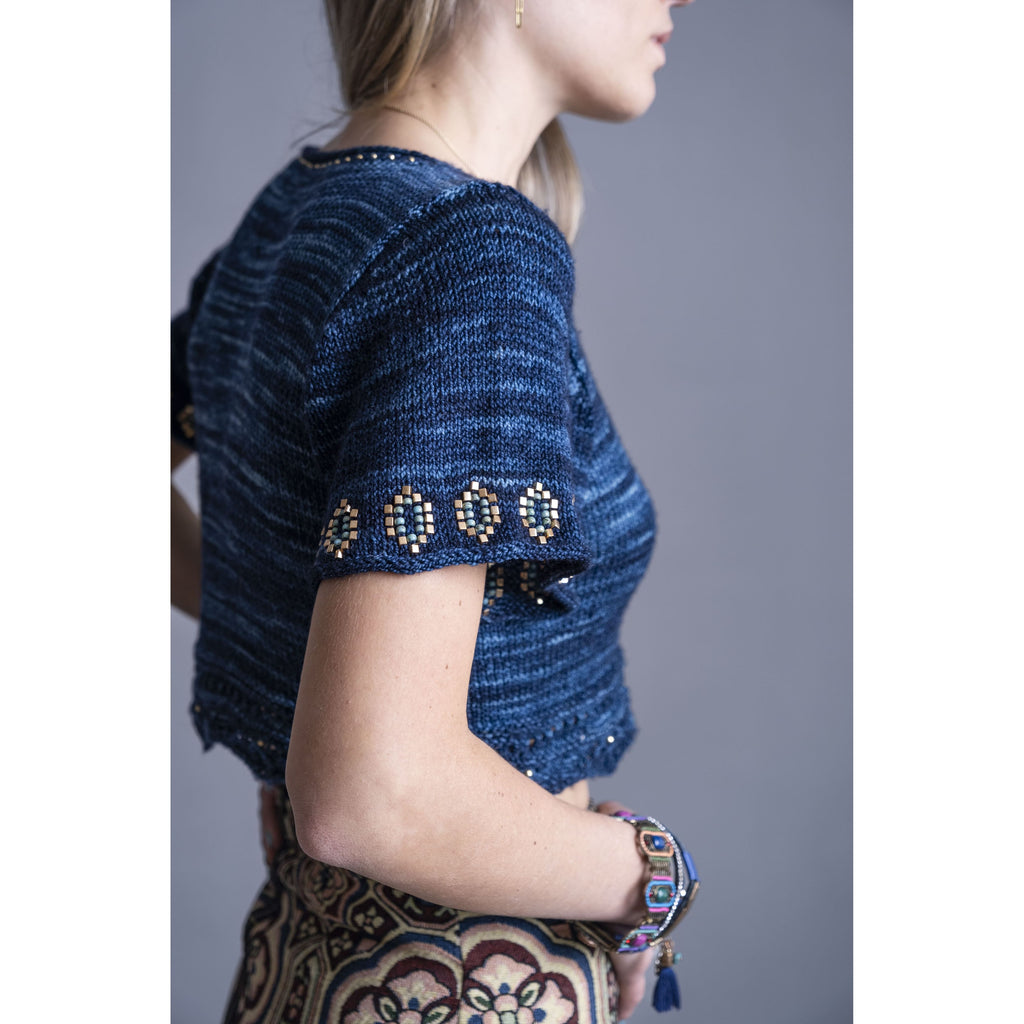 The Diamonds top is a beautiful pattern worked in the round from the bottom up, completely seamless. A delicate lace pattern emphasizes the hem, and beads add extra interest to the neckline, hem, and cuffs.