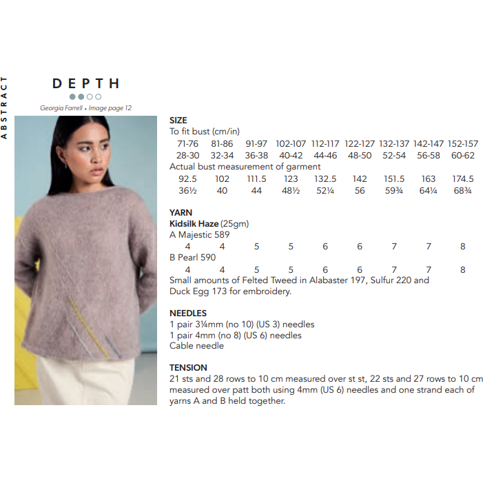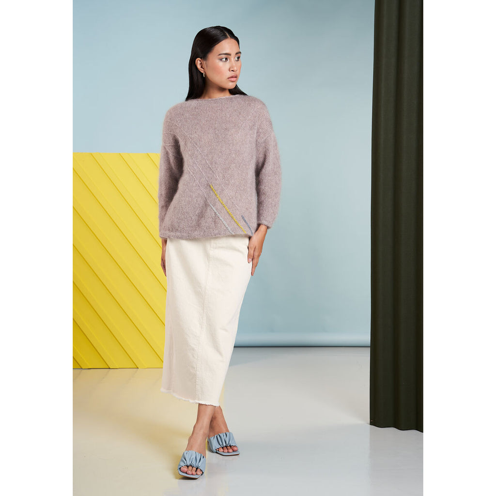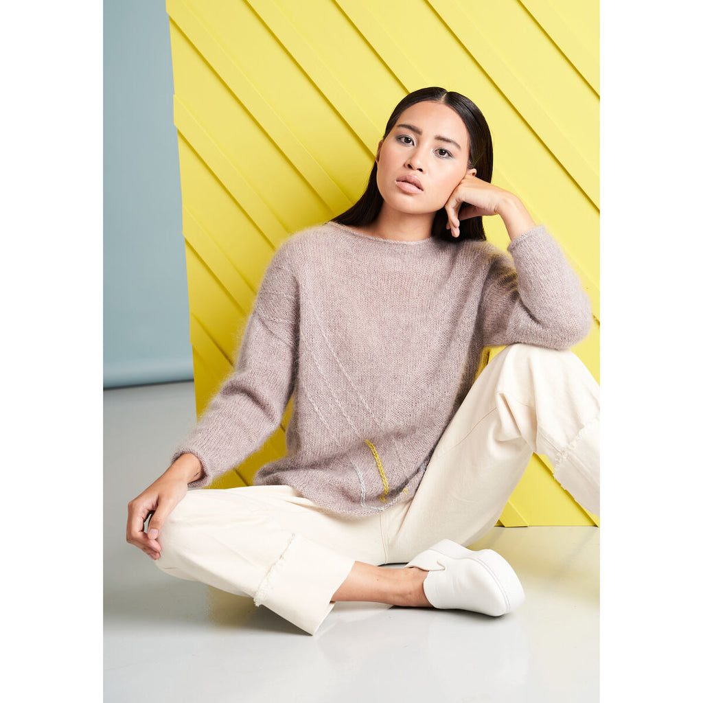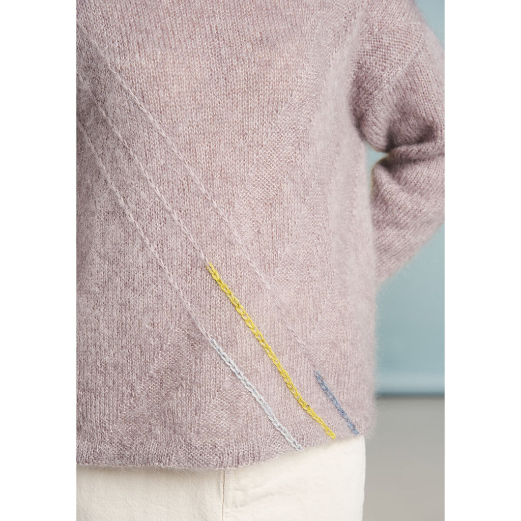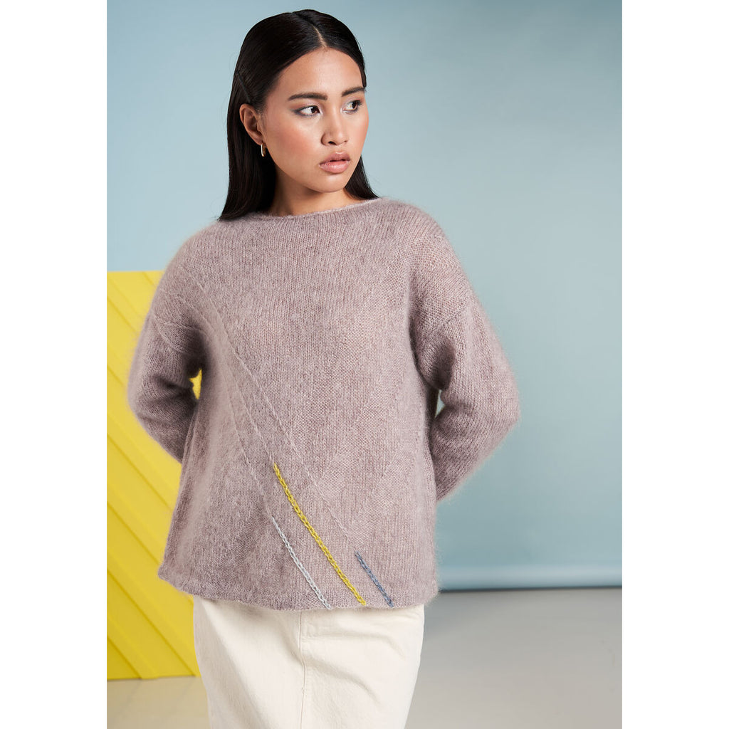 Designed by Georgia Farrell, this classic boat neck sweater is given a modern twist with the use of stocking and garter stitch texture details as well as diagonal chain stitch embroidery that runs from the hip to shoulder across the front of the chest. This beautiful sweater is knitted in the ever popular Kidsilk Haze and features drop shoulders and bracelet length sleeves.