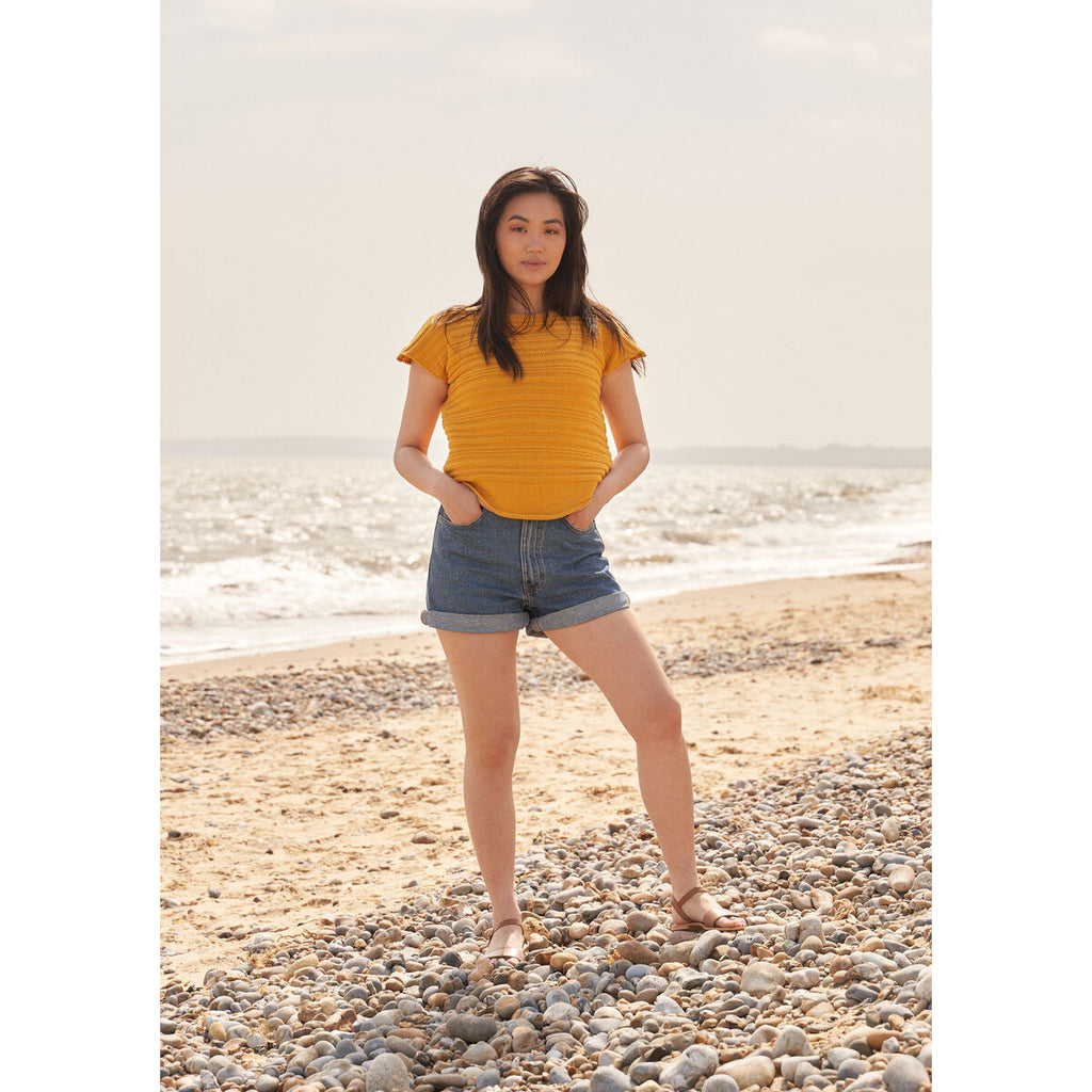 Knitted in Cotton Glace, this is a modern twist on the classic short-sleeved summer tee by Quail Studio. Short-row shaping has been used to create a flattering curved hem, and the body and sleeves are worked in bands of stocking stitch and reverse stocking stitch. The neckline and the sleeves are neatly finished off with a simple pick-up/cast off edging.