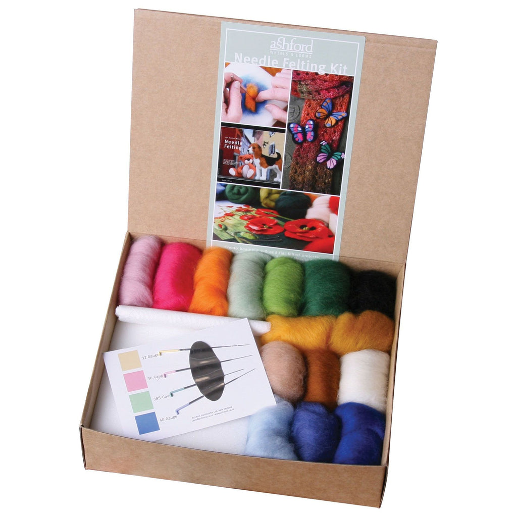 Dive into needle felting with this complete starter set, featuring The Ashford Book of Needle Felting by Barbara Allen. Learn essential techniques, explore project templates, and discover tips for working with wool. Kit includes 4 types of felting needles, 15 colours of Corriedale fibre, a felting foam block, and wash-away fabric. Perfect for beginners, this set has all the tools and materials you need to start making beautiful felted creations straight away, while also giving you a resource you’ll return to for years.