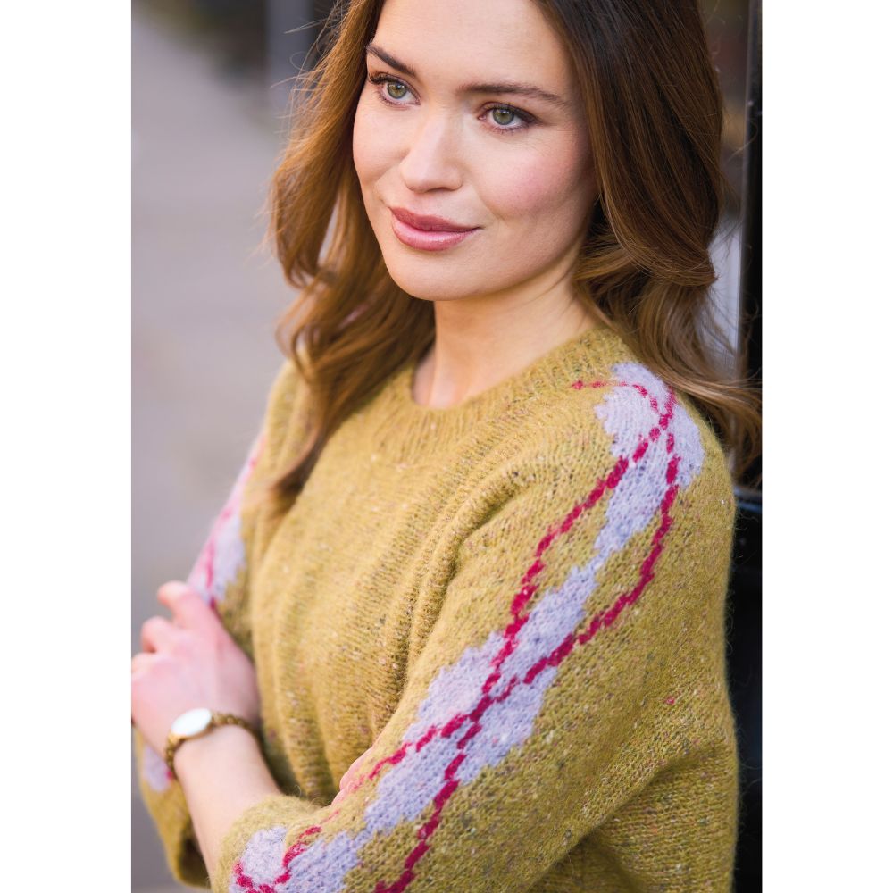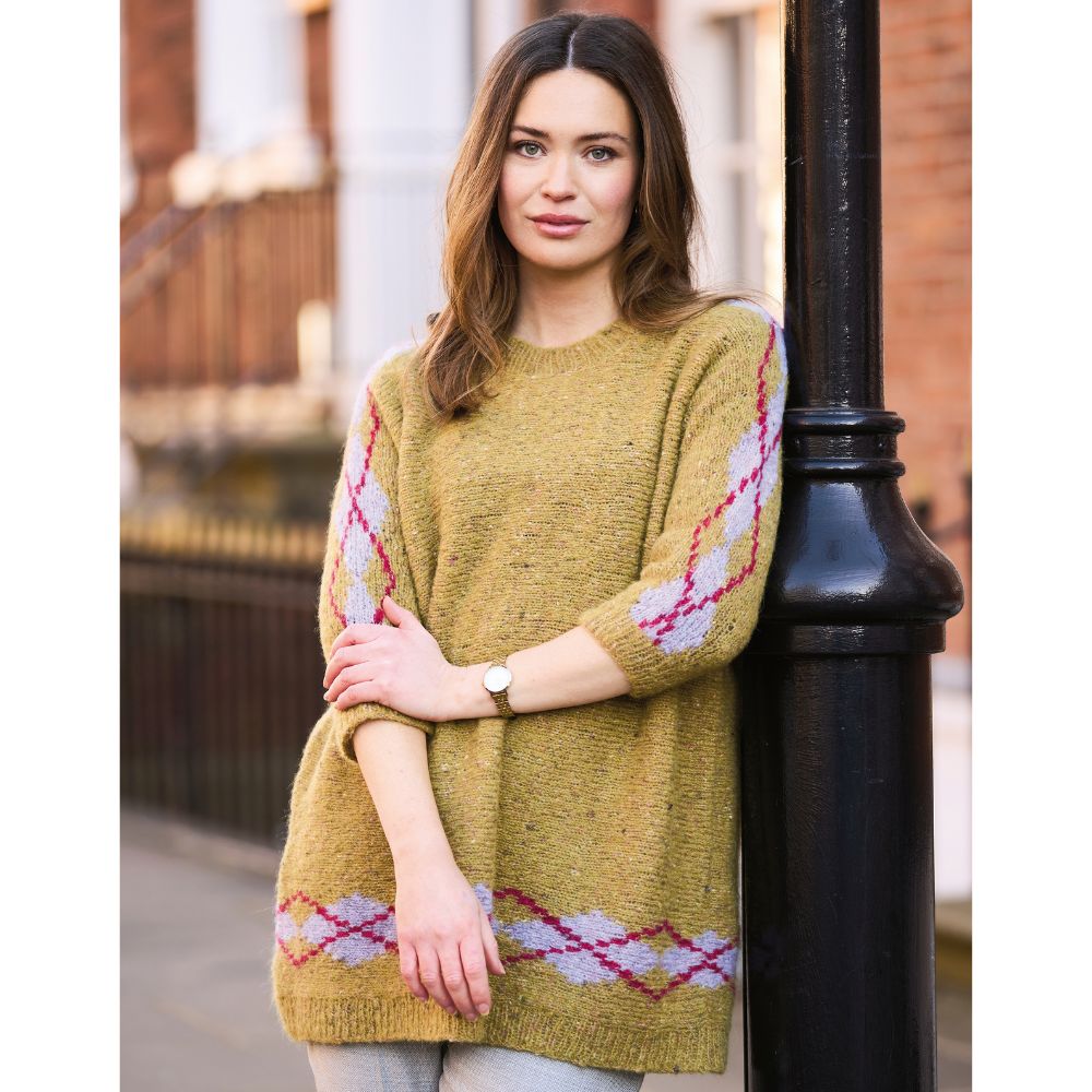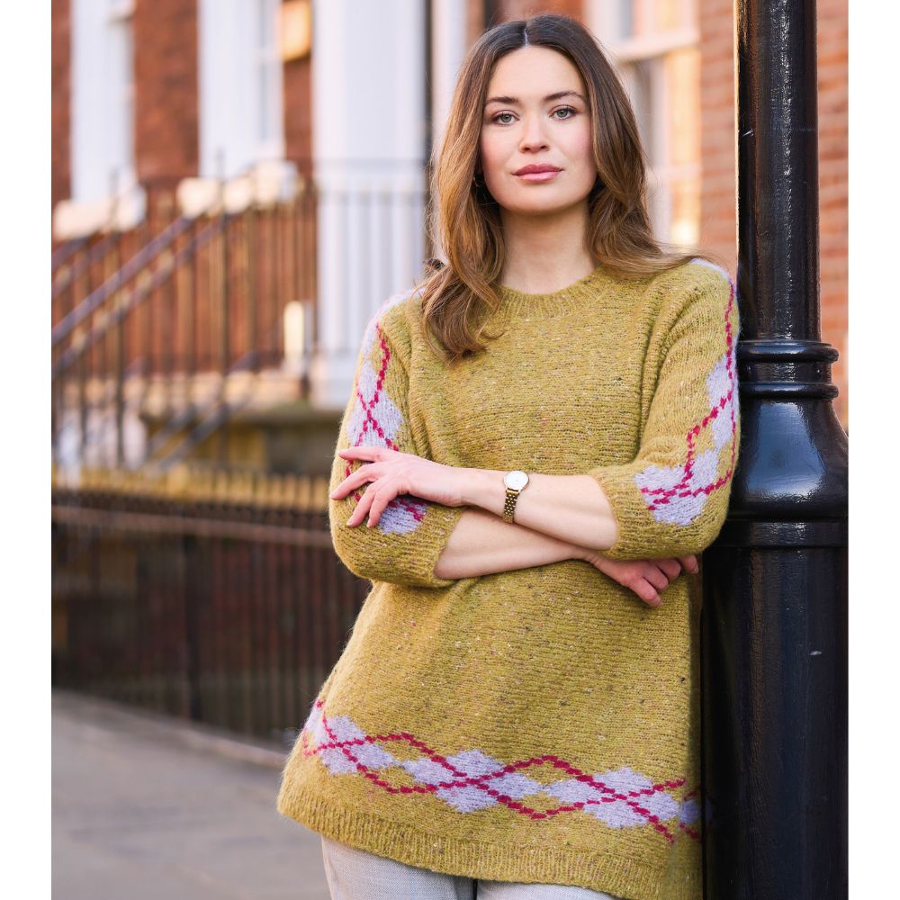 This oversized sweater has a loose fitting body with a tight cropped sleeve. Designed by Georgia Farrell, the sweater is knitted using three shades of Rowan Fine Tweed Haze. It is knitted in a single sideways piece with the argyle pattern worked in both intarsia and fairisle on the sleeves and hem. A round neck worked in rib completes this flattering piece.