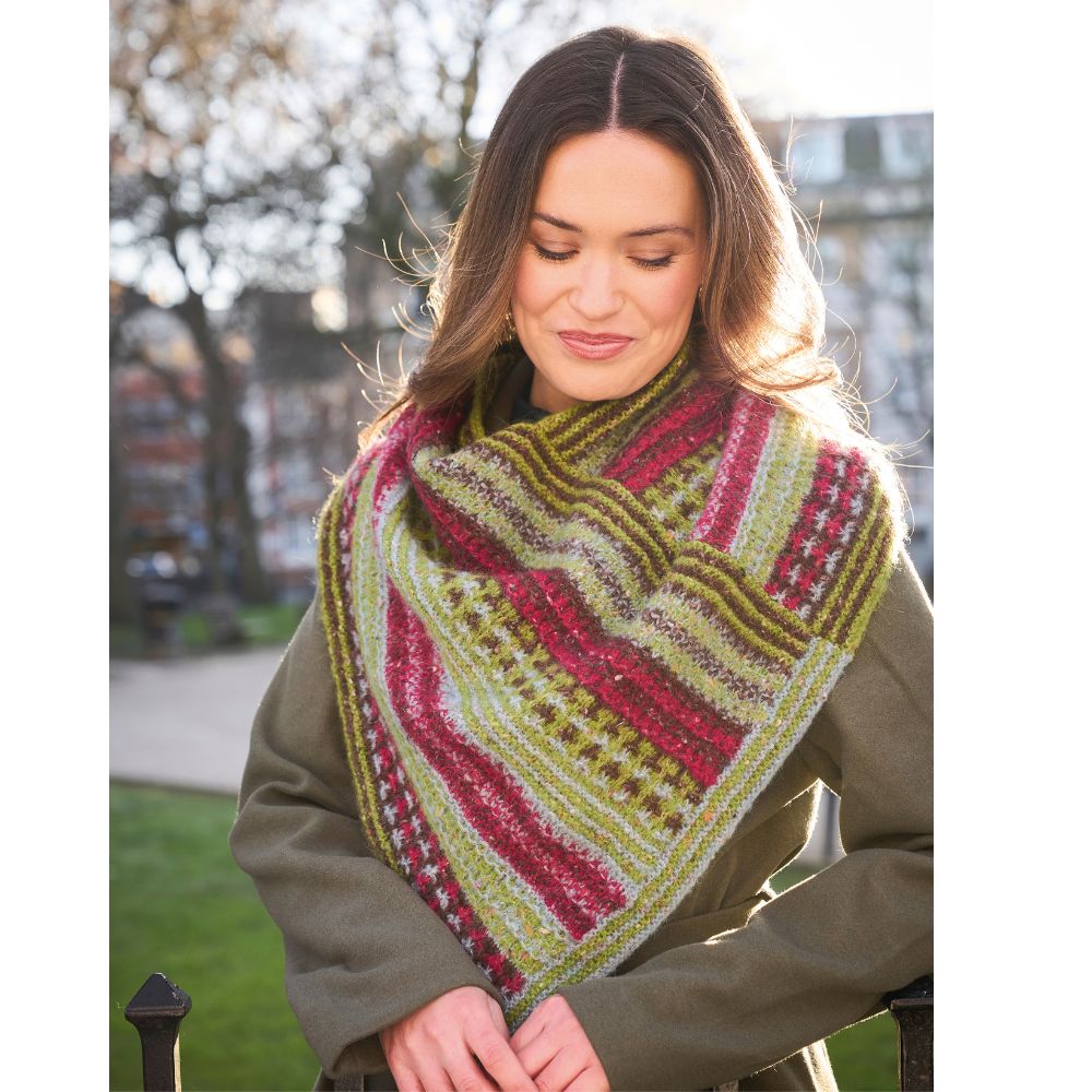 This slip stitch cowl by Lisa Richardson is worked lengthways as a single rectangle and then sewn along one edge to create a triangular shape. It is knitted in four beautiful shades of Rowan Fine Tweed Haze.