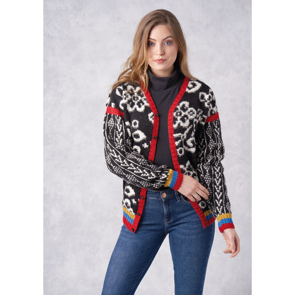 The Bror drop shoulder cardigan has an all-over intarsia pattern and uses five shades of Rowan Selects Norwegian Wool. Designed by ARNE & CARLOS, it features long sleeves, colour-tipped edging and rib details at the cuffs - this is a quintessentially Scandi-inspired design.