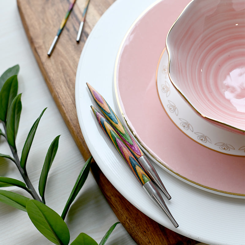 Interchangeable knitting needle tips in glorious multi colour wood grain are one of the most popular choice in the KnitPro ranges called 'Symphony'. Not only do they look lovely but feel great when knitting. It's easy to see why so many knitters have adopted Symphony circular knitting needles. Treat yourself with a pair.