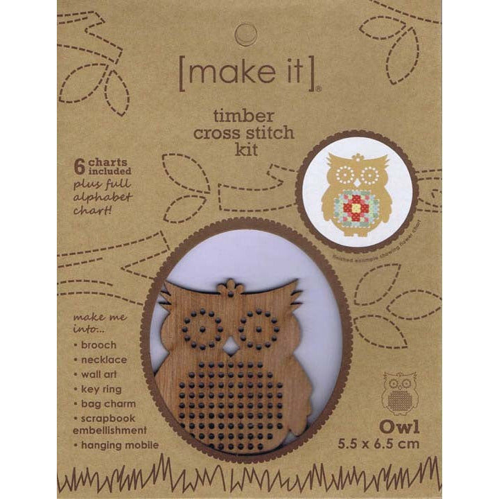 Stitchery kit with owl shaped, laser cut timber frame. The frame has pre-drilled holes that can be used just like the holes in aida fabric for cross stitch (X-stitch) and embroidery.