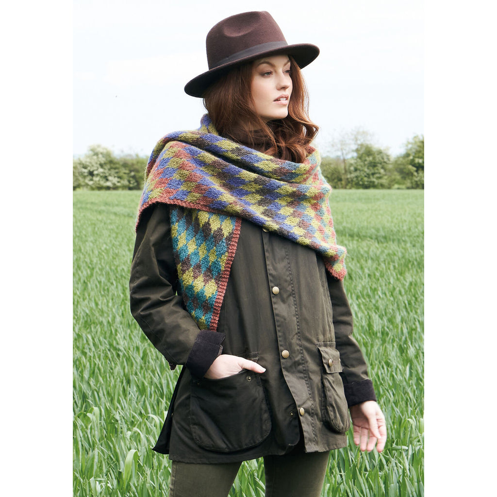 Designed by Lisa Richardson, this fairisle shawl uses three shades of the beautiful Felted Tweed Colour. The shawl features a garter stitch edging but the pattern is otherwise worked entirely in stocking stitch. The triangular shape is achieved by increasing at one edge only. The finished shawl measures approx 47 cm (18 1/2 in) at the widest point and 170 cm (67 in) along the longest edge.